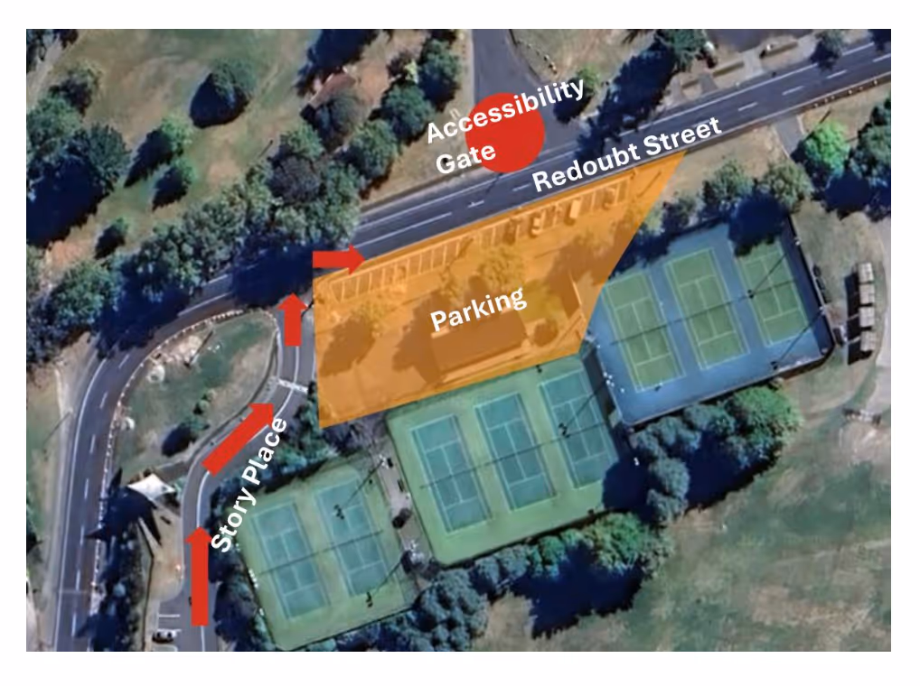 Parking is available on Redoubt Street outside the tennis club. For access you must go down Storey Place and turn right onto Redoubt Street. Traffic management will be on site to assist, please present your mobility parking permit.